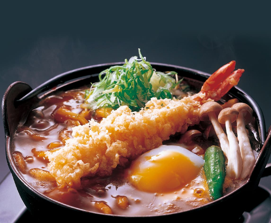 人気の黒豚スープに、ぷりぷりの大きな海老と、ぷるぷるの温玉が入ったカレーうどんを、鉄鍋でグツグツ煮込んでご用意する、身体を芯から温める、冬の一番人気のカレーうどんです。是非ご賞味下さいませ。